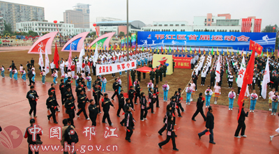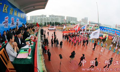 上午8時30分,區(qū)政府副區(qū)長范梅青宣布開幕式開始,由來自邗江中小學(xué)校、鎮(zhèn)(街道)、區(qū)級機(jī)關(guān)以及部分企業(yè)的36支代表團(tuán)方陣,在國旗、會徽和鮮花隊(duì)、彩旗隊(duì)、鼓號隊(duì)的引導(dǎo)下健步走進(jìn)田徑場,一一接受省、市、區(qū)各級領(lǐng)導(dǎo)的檢閱。